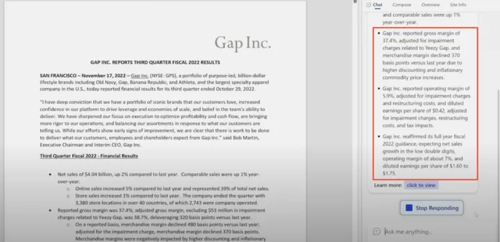 在 New Bing 发布会视频 35:49 处,Yusuf 展示集成了 New Bing 的 Edge 浏览器,对于打开的服饰公司盖璞 (Gap) 2022 年第三季度的财报,如何进行要点生成。乍眼一看,New Bing 的总结非常实用,用关键点的方式庖丁解牛一般展示了 Gap 三季报的要点,巴菲特看到此或许也会「惊为真人」。然而,当我们找出 Gap 2022 年三季报 [9],仔细阅读过后,发现 New Bing 的总结错漏百出,让人不忍直视
