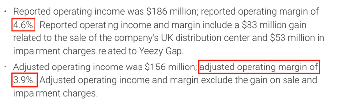 首先,New Bing 给出了 Gap 调整后的运营毛利率(reported operating margin, adjusted for impairment charges and restrucring costs)为 5.9%。然而在财报中,Gap 的运营毛利率是 4.6%,调整后则是 3.9%。