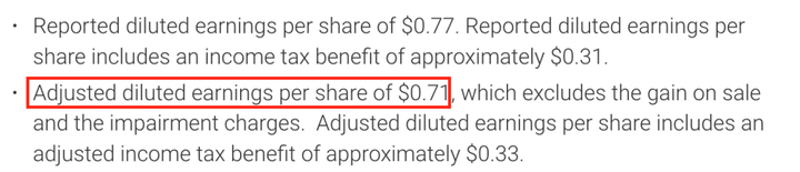 New Bing 接下来又给出调整后摊薄每股收益为 0.42 美元(diluted earnings per share, adjusted for impairment charges, restrucring costs and tax impact),但财报里的数据则是 0.71 美元。