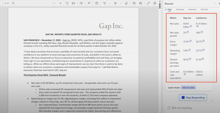 图 9 New Bing 对 Gap 和 Lululemon 财报对比功能