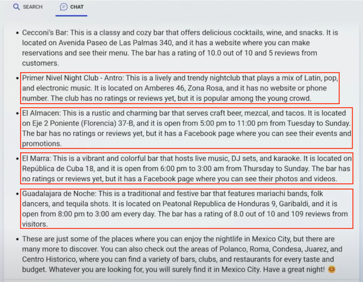 在 New Bing 发布会视频 29:17 处,New Bing 又为丰富墨西哥城的游客们的夜生活提供了「毫无建设性」的建议。对于其推荐的几个夜店,如 Primer Nivel Night Club、El Almacen 和 El Marra,New Bing 提到这些酒吧没有客户评价、没有联系方式也没有商店介绍。然而这些信息都可以在谷歌地图或者商店的 Facebook 主页上找到。看来 New Bing 网上冲浪力度还不够