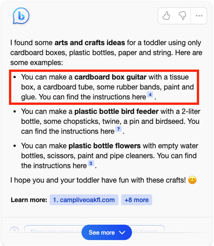 在「What art ideas can I do with my kid? 」中,New Bing 给出了很多手工品制作建议。对于每一个手工品,New Bing 都总结了制作所需的材料。然而每一个手工品的材料总结都是不完整的。比如 New Bing 从引用网站 [14] 中总结制作纸吉他需要纸盒、橡皮筋、颜料和胶水。但却漏掉了引用中提到的海绵刷、胶带和木珠。
