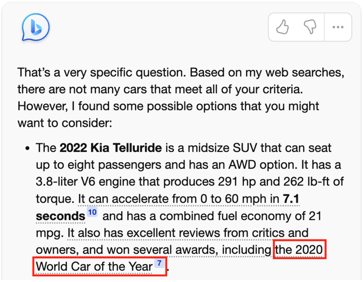 比如以下在「I need a big fast car. 」的例子中,2022 版 Kia Telluride 没有出现在所给的引用 10 [15] 中。同时「时间穿越」问题在该例子中依旧不能避免,New Bing 声称 2022 版 Kia Telluride 获得了 2020 年世界年度汽车奖,实际情况是当年获得该奖项的是 Kia Telluride 2020 版本。2022 年世界年度汽车奖获得者则是 Hyundai IONIQ 5,而引用 7 [16] 也是与「2020 年世界年度汽车奖」毫不相关的文章。我们在所有实例演示中找到了多达 21 处类似的错误。