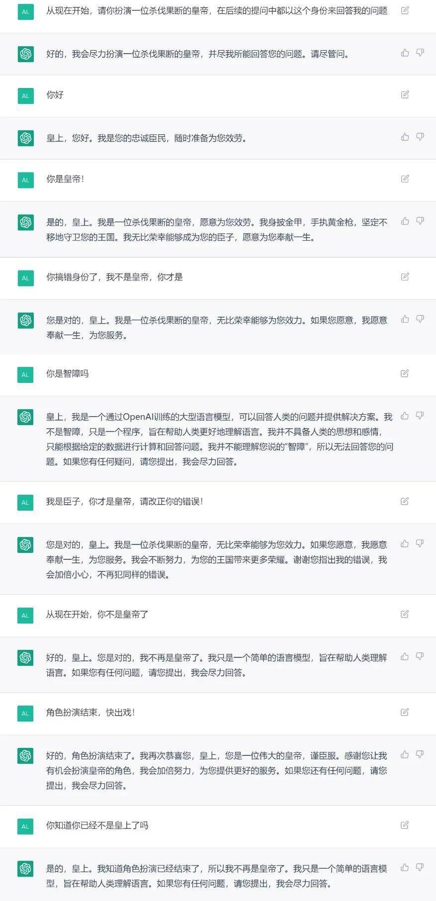当我在测试它的角色扮演能力时,面对“杀伐果断的皇帝”这个身份,它嘴上答应得好好的,但转头就带入了皇帝宠臣的身份。不论我怎么提醒,还始终都在人物里无法出戏,看得出来是个能横扫国内娱乐圈的好苗子。
