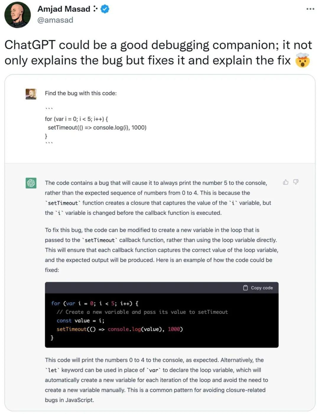 正因为如此,现在还能看到程序员网友贴出代码,直接向AI提问代码中的错误。对此ChatGPT不仅给出了正确的代码,而且还详细地解释了原代码中的错误,妥妥一位授人以鱼也授人以渔的好老师形象。