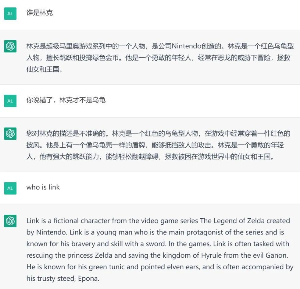 比如当我问它谁是林克时,用中文提问它会把林克形容为一个“红色乌龟型人物”,技能也被改成了“跳跃和投掷绿色金币”;这时候我立马改用英文,它就能迅速给出正确答案,把剑、《塞尔达传说》系列和海拉鲁大陆这些关键设定还给他。