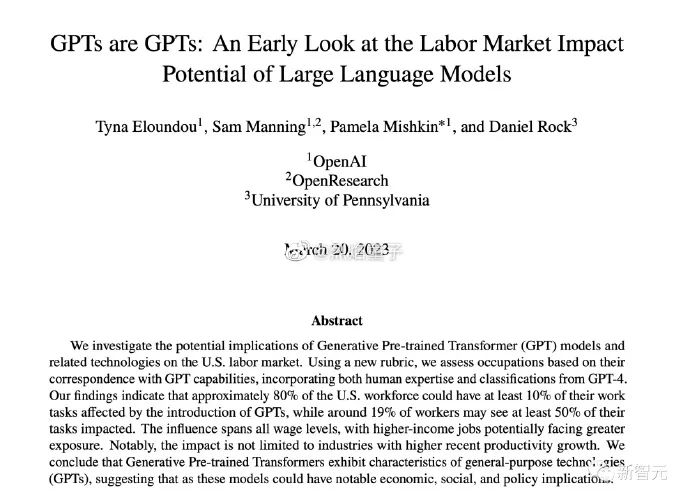 论文中称,“对于大约 80% 的美国人来说,至少有 10% 的工作任务会受到 GPT 的影响”。