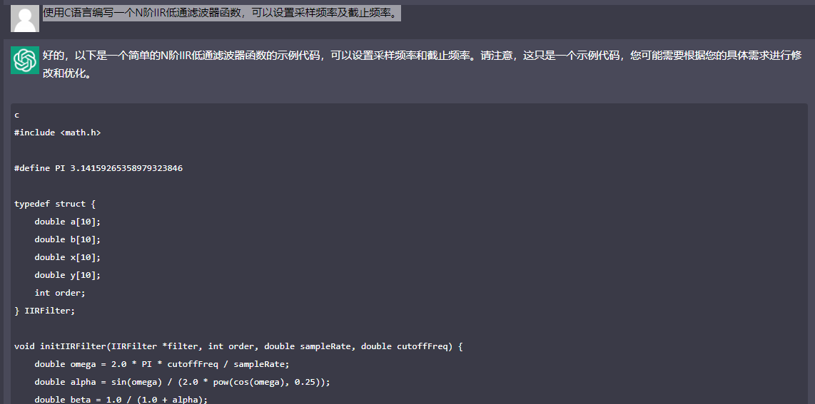 很遗憾,这样的结果对我来说是无法接受的。鉴于我过去使用ChatGPT FREE的经验,我在提出问题时改变了顺序并增加了一些要求:我希望能够使用C语言编写一个N阶IIR低通滤波器函数,并且能够设置采样频率和截止频率。