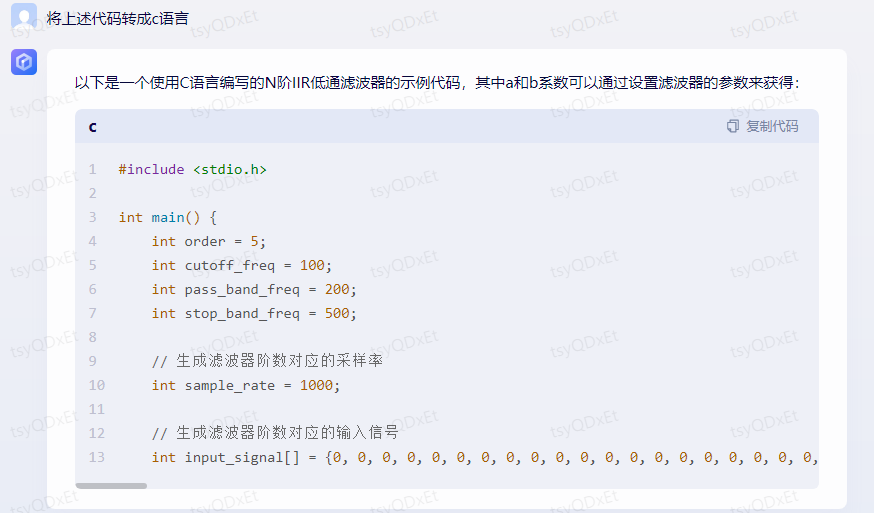 相比于ChatGPT FREE的第一次测试,文心一言没有生硬的拒绝问题反馈,直接输出了代码,但是代码只是一个模板,并且滤波器的样式显然不是IIR低通滤波器,并且滤波器的参数全是0,也就是说无法简单修改使用,考虑到不同AI框架的差异性,我临时决定换一种问答策略,采用分布式提问,大体思路是先让文心生成PYTHON,然后再让他转成C语言代码。