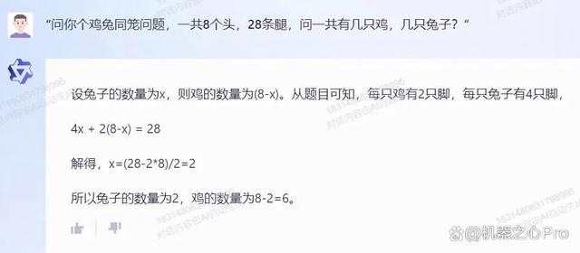 调戏 ChatGPT 类产品,最经典的数学问题就是鸡兔同笼,这也曾难倒了一大批对话模型。我们也拿这个问题考验下它: