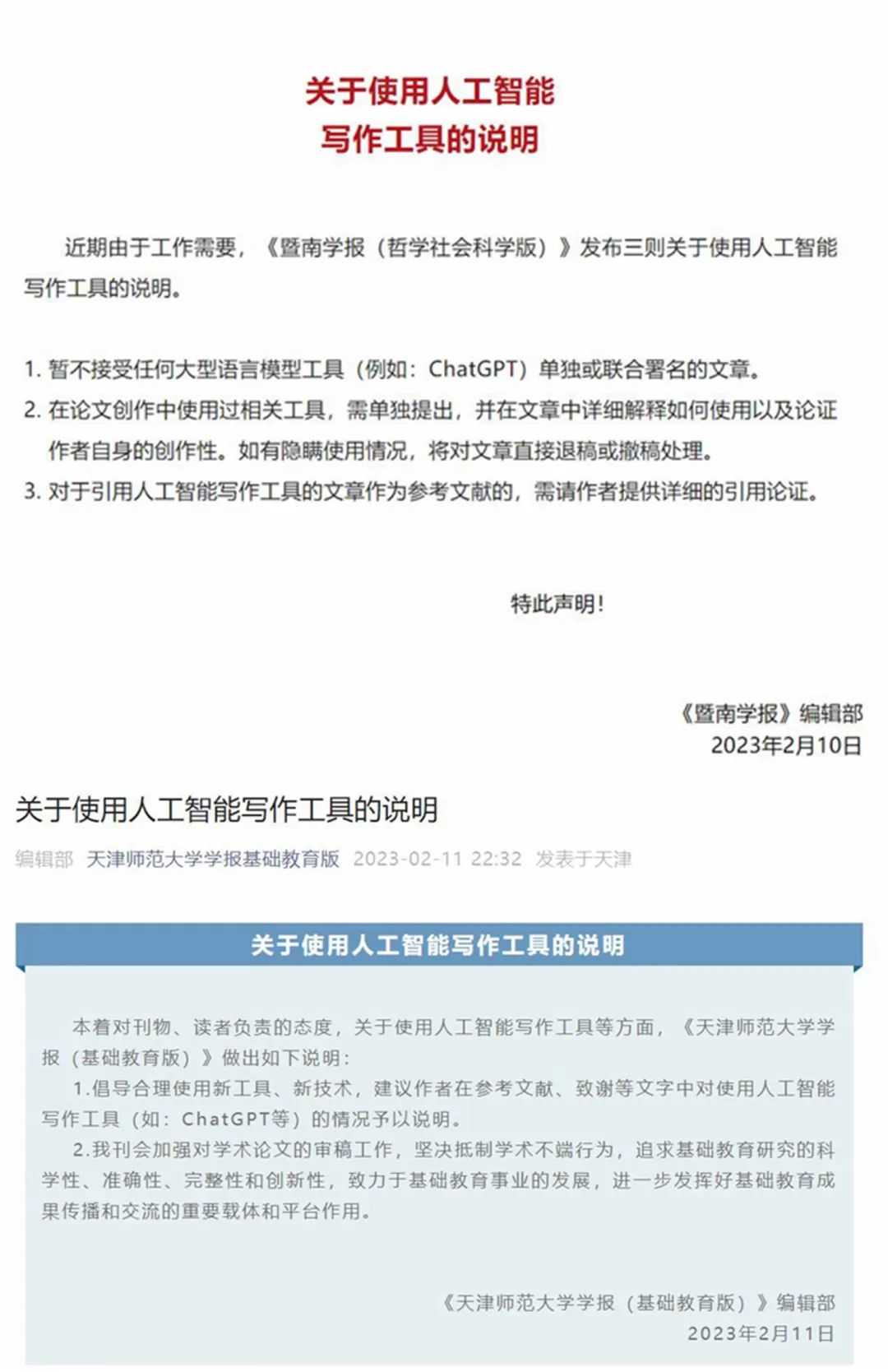 ChatGPT是一种基于自然语言处理(NLP)和机器学习的语言模型,是人工智能自然语言处理工具的最新成果,它不仅能够与人类进行对话,而且能够生成可信的“创造性”内容。目前,该产品以一种无特别限制方式被普通用户或开发者所使用,因此被用户尝试出了各种可能的应用方式,其智能程度也被认为得到了广泛认同。国外一项对1000多名学生展开的调查显示,超过89%的学生使用ChatGPT来帮助完成家庭作业。一位大学教授曾告诉媒体,他发现班上最好的论文是由ChatGPT创作的。教育部门因此普遍对ChatGPT持谨慎态度,美国多所公立学校禁用了ChatGPT,原因是担心作弊。纽约市教育部门发言人认为,该工具“不会培养批判性思维和解决问题的能力”。多家科学期刊也禁止将ChatGPT列为论文“合著者”。有批评者指出,这是一种“高科技剽窃”和“避免学习的方式”。也有人认为,传统教育将被彻底颠覆。近日,《暨南学报(哲学社会科学版)》《天津师范大学学报(基础教育版)》也发布相关声明,提出暂不接受任何大型语言模型工具(例如:ChatGPT)单独或联合署名的文章,或建议对使用人工智能写作工具的情况予以说明。