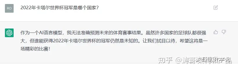 是的。目前ChatGPT里的原材料都是2021年之前生产的,所以无法回答“2022年卡塔尔世界杯冠军是哪个国家?”这样一些问题。说得更简单一点,它还活在2021年。