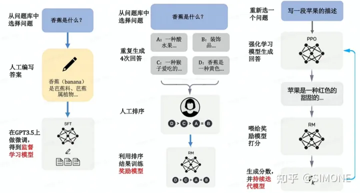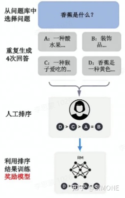 首先,模型根据问题生成多个答案。人工对给定的答案进行排序和打分。机器通过人工打分的数据训练奖励模型,可以预测用户更喜欢哪个模型输出。