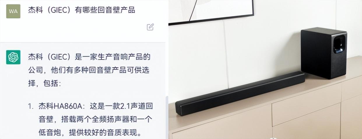 ChatGPT的表现令人感到惊喜。在众多选项中,我毫不犹豫地选择了杰科最新款的回音壁音响HA860A。这款音响设备是杰科备受关注的一款2.1声道回音壁音响,具备低音炮的套装配置,可以兼顾中高频和中低频的音质表现。然而,唯一令人有些遗憾的就是它并没有提供过多的功能介绍。