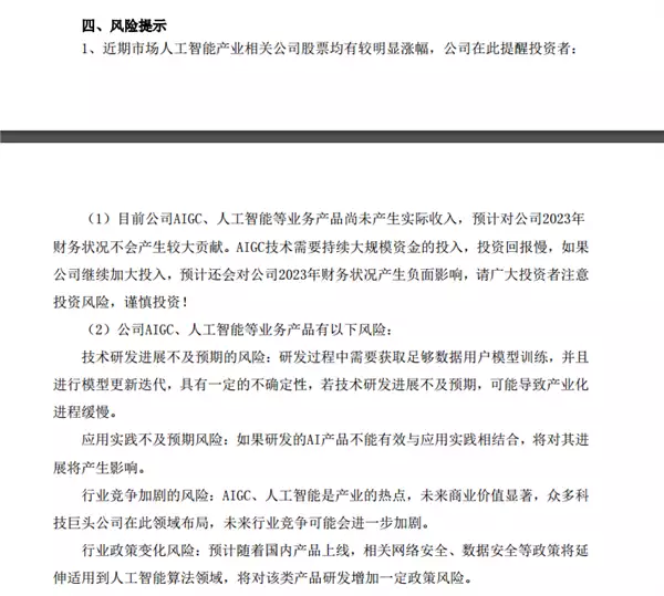 而收到深交所监管函之后,昆仑万维回复的侧重出现了改变。先是说明公司AIGC、人工智能等业务产品尚未产生实际收入。随后又澄清与外部合作的类ChatGPT产品公司并无版权,只有分享权益,还强调了产品商业化的不确定性。
