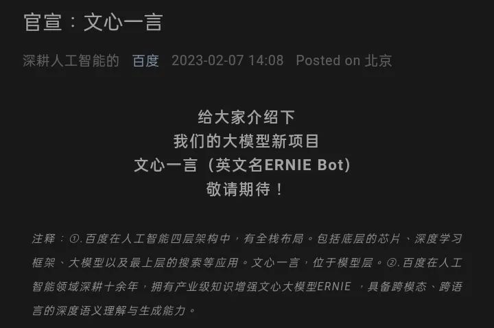 国内早已宣称“All in AI”的百度,也宣布类似产品“文心一言”。