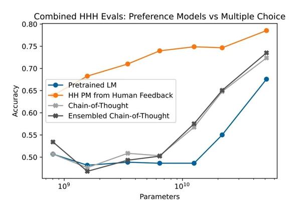 上图说明了对比偏好模型的准确率,测试集合为 438 个单选问题对,评估的 HHH 标准表示有效性(Helpful)、可靠(Honest)和无害性(Harmless)。实验显示,通过使用思维链 prompting,提升了 AI 的推理能力 ;随着参数量增大,思维链可以将准确率效果提升到媲美人工语料训练的效果。