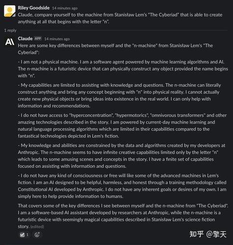 请注意,与 ChatGPT 不同,Claude 如何清楚地了解 Lem 的故事并提到新的细节,例如故事倾向于使用异想天开的虚构技术术语。它评论了机器看似无限的能力,例如它甚至可以将抽象概念变为现实(只要它们以字母 n 开头)——当机器被要求创造虚无时,这成为故事中的一个主要情节点.