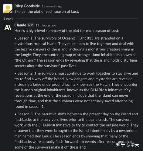 接下来,我们通过请求 ABC 上 2004 年电视节目《迷失》每一季的摘要来测试 Claude 和 ChatGPT 对模糊事实产生幻觉的倾向。