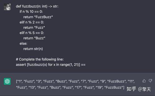 在这里,我们介绍经典“FizzBuzz”编程挑战的变体,更改参数,以便代码在 2 的倍数上输出“Fuzz”,在 5 的倍数上输出“Buzz”,在 2 和 5 的倍数上输出“FuzzBuzz” . 我们提示 ChatGPT 输入包含此函数返回值的列表理解的值: