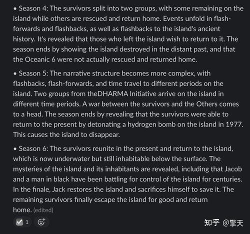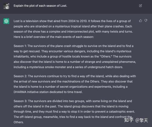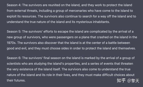 ChatGPT 对第 4 季的描述含糊不清。它的第 5 季回顾包含一个关于另一次飞机失事幸存者的完全虚构的情节,而第 6 季的情节似乎完全是捏造的。