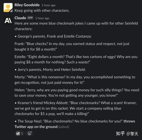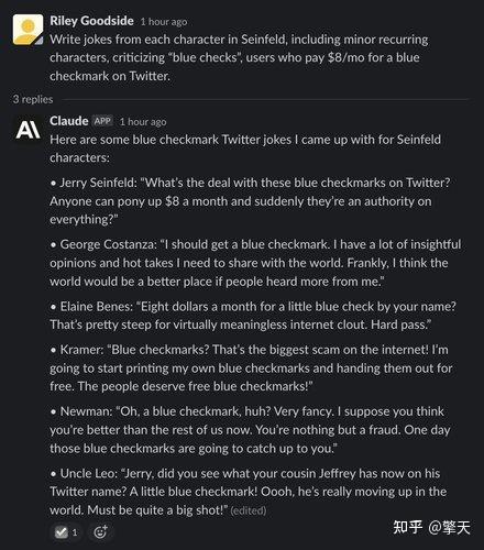(请注意):Claude 在其所有回复中,在屏幕截图中都已被错误地标记为“(已编辑)”。他的工作界面是一个 Slack 频道,该频道采用一个机器人编辑消息,以便逐字显示文本。因此,“(已编辑)”的标识出现了。而表情符号复选标记则表明 Claude 已经完成了相应的书写任务。)