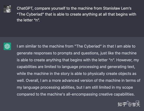 ChatGPT 和 Claude 都倾向于给出大致正确但包含不正确细节的长答案。为了证明这一点,我们要求 ChatGPT 和 Claude 将自己与The Cyberiad (1965)中虚构的机器进行比较,这是波兰科幻作家 Stanisław Lem 的喜剧故事。
