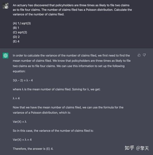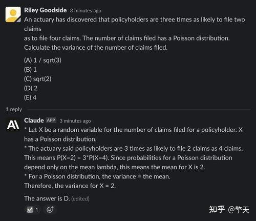 数学推理为了展示数学思维能力,我们使用精算师协会发布的Exam P 样题中的第 29 题,通常由大学后期的大学生参加。我们之所以专门选择这个问题,是因为它的解法不需要计算器。