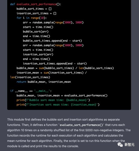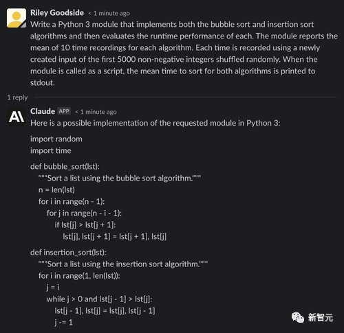 Claude在背诵排序代码上也没什么问题,不过在评估代码时,Claude 犯了一个错误: 每个算法使用的输入是随机选择的5000个整数(可能包含重复) ,而prompt中要求的输入是前5000个非负整数(不包含重复)的随机排列。