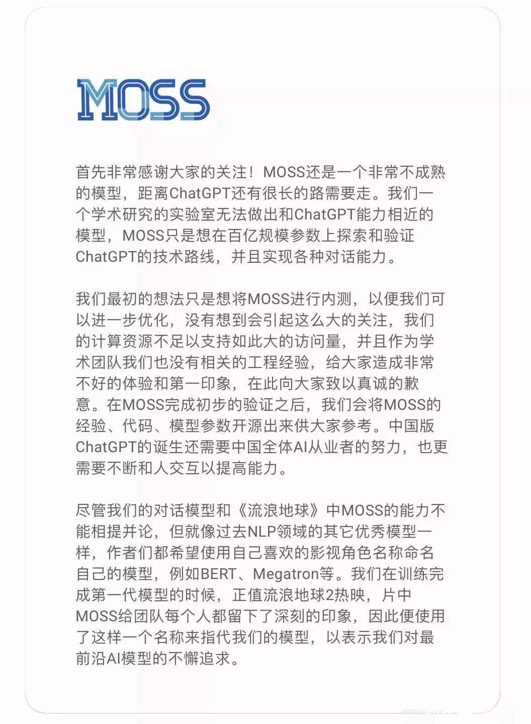 🎉 复旦MOSS:模型还在成长中,我们只是想先进行内部测试!未来,我们会将我们的经验、代码和模型参数开源给大家参考!🚀在MOSS完成初步验证后,我们将把我们的学习过程、代码和模型参数分享给更多的人。让我们一起探索这个充满无限可能的领域吧!🚀如果您对MOSS感兴趣,或者想要参与内部测试,请随时关注我们的更新!我们期待您的加入!🎉#复旦MOSS #模型成长 #开源分享 #ChatGPT