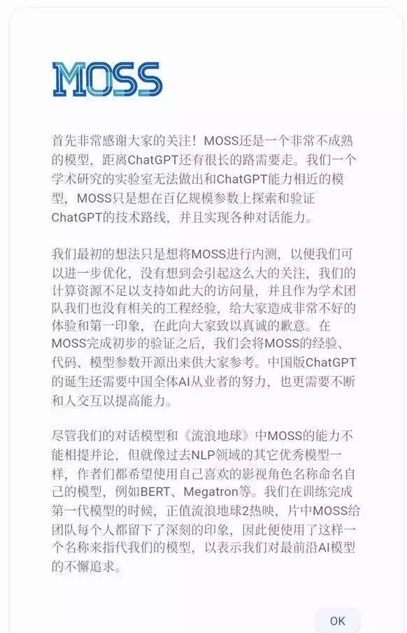 对于此次内测带来的不好体验,MOSS 团队也表示,尽管MOSS还有很大改善空间,但它的问世证明了在开发类ChatGPT产品的路上,国内科研团队有能力克服技术上的重要挑战。据悉,MOSS研发项目得到了上海人工智能实验室的有力支持。
