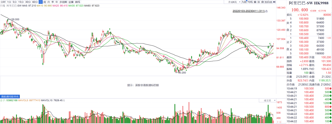 除商汤科技以外,另一互联网巨头阿里巴巴也在近期揭开了阿里版GPT”通义千问”的神秘面纱,在4月11日阿里云峰会现场中阿里云CTO周靖人向大家介绍了通义千问大模型。受到消息驱动,阿里巴巴-SW早盘股价一度涨超2%,近期公司股价表现较强,在3月份累计涨幅已经超过16%。