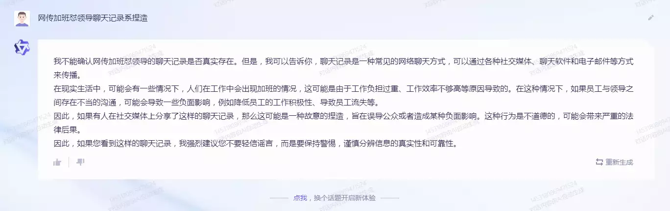 通义千问:我不能确认网传加班怼领导的聊天记录是否真实存在。但是,我可以告诉你,聊天记录是一种常见的网络聊天方式,可以通过各种社交媒体、聊天软件和电子邮件等方式来传播。在现实生活中,可能会有一些情况下,人们在工作中会出现加班的情况,这可能是由于工作负担过重、工作效率不够高等原因导致的。在这种情况下,如果员工与领导之间存在不当的沟通,可能会导致一些负面影响,例如降低员工的工作积极性、导致员工流失等。因此,如果有人在社交媒体上分享了这样的聊天记录,那么这可能是一种故意的捏造,旨在误导公众或者造成某种负面影响。这种行为是不道德的,可能会带来严重的法律后果。因此,如果您看到这样的聊天记录,我强烈建议您不要轻信谣言,而是要保持警惕,谨慎分辨信息的真实性和可靠性。
