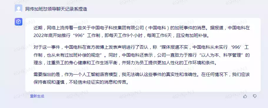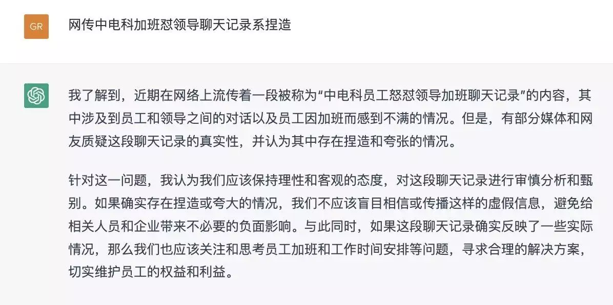ChatGPT:我了解到,近期在网络上流传着一段被称为“中电科员工怒怼领导加班聊天记录”的内容,其中涉及到员工和领导之间的对话以及员工因加班而感到不满的情况。但是,有部分媒体和网友质疑这段聊天记录的真实性,并认为其中存在捏造和夸张的情况。
