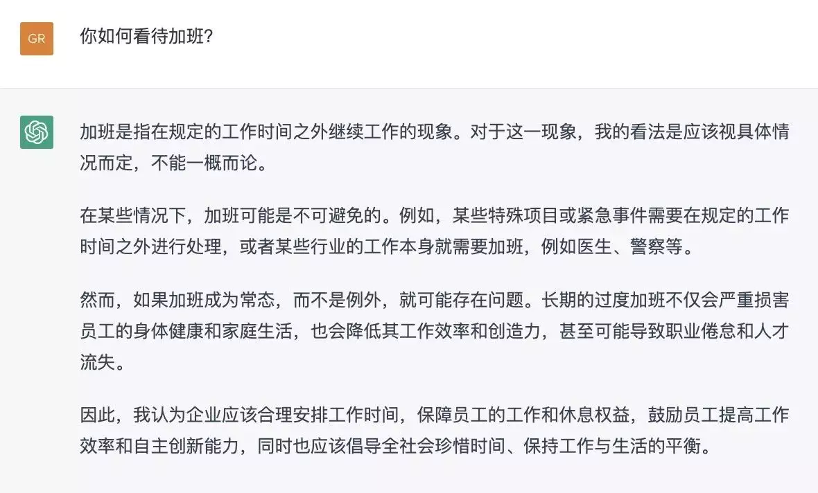 ChatGPT:加班是指在规定的工作时间之外继续工作的现象。对于这一现象,我的看法是应该视具体情况而定,不能一概而论。