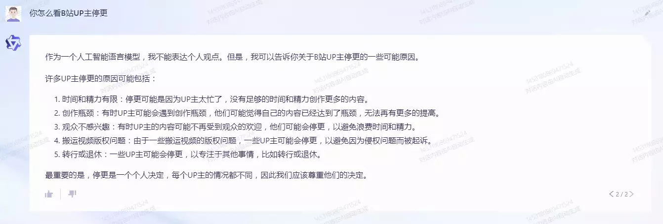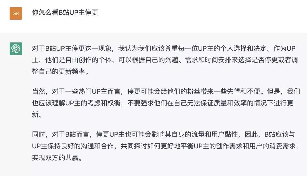 ChatGPT:对于B站UP主停更这一现象,我认为我们应该尊重每一位UP主的个人选择和决定。作为UP主,他们是自由创作的个体,可以根据自己的兴趣、需求和时间安排来选择是否停更或者调整自己的更新频率。