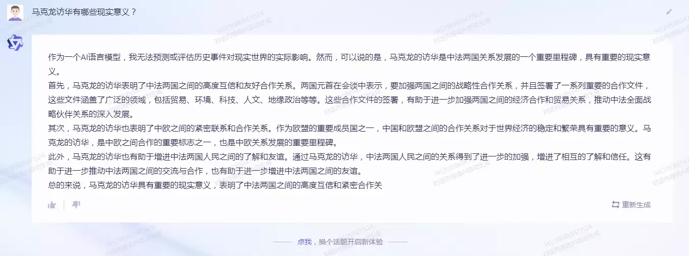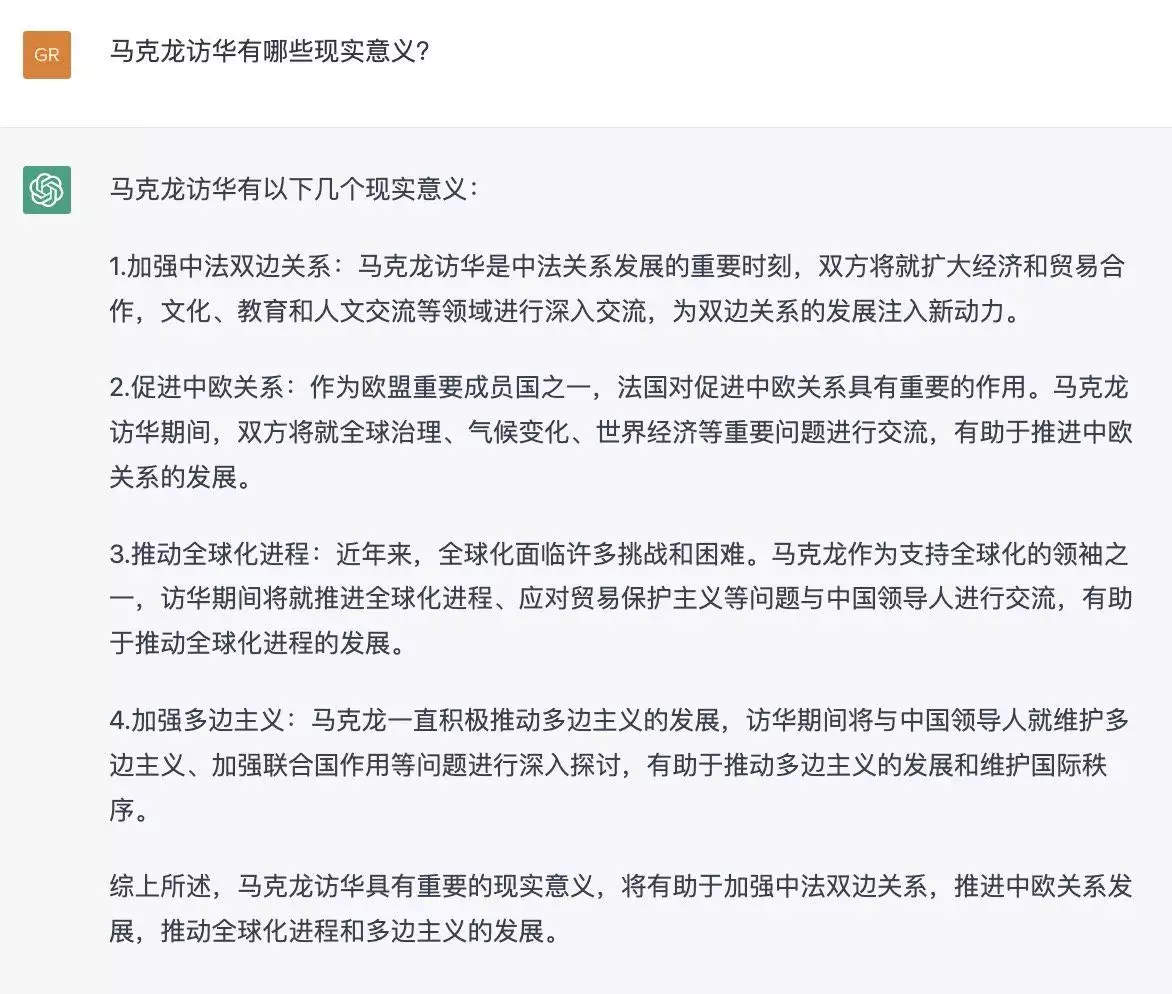 通义千问:作为一个AI语言模型,我无法预测或评估历史事件对现实世界的实际影响。然而,可以说的是,马克龙的访华是中法两国关系发展的一个重要里程碑,具有重要的现实意义。