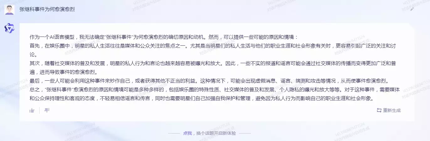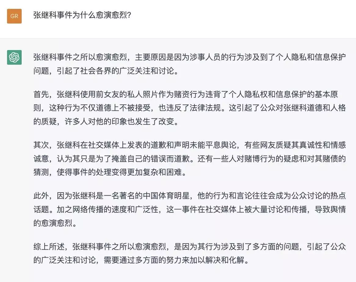 ChatGPT:张继科事件之所以愈演愈烈,主要原因是因为涉事人员的行为涉及到了个人隐私和信息保护问题,引起了社会各界的广泛关注和讨论。