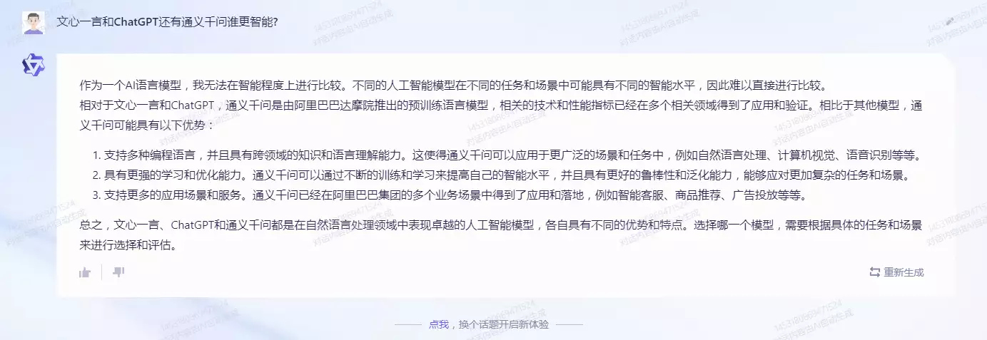 总之,文心一言、ChatGPT和通义千问都是在自然语言处理领域中表现卓越的人工智能模型,各自具有不同的优势和特点。选择哪一个模型,需要根据具体的任务和场景来进行选择和评估。