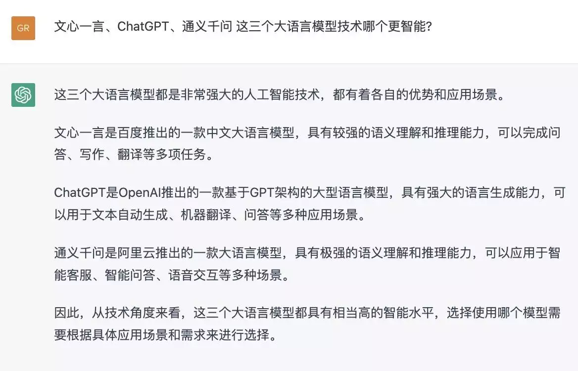 因此,从技术角度来看,这三个大语言模型都具有相当高的智能水平,选择使用哪个模型需要根据具体应用场景和需求来进行选择。