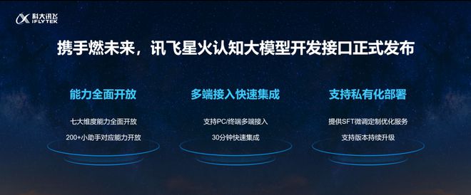此次开发接口发布为开发者、企业提供了PC/终端多端接入方式,30分钟可快速集成。七大维度能力,200+小助手对应功能全面开放。同时,针对行业、企业的保密需求,支持私有化部署,提供SFT微调定制优化服务,支持版本持续升级。