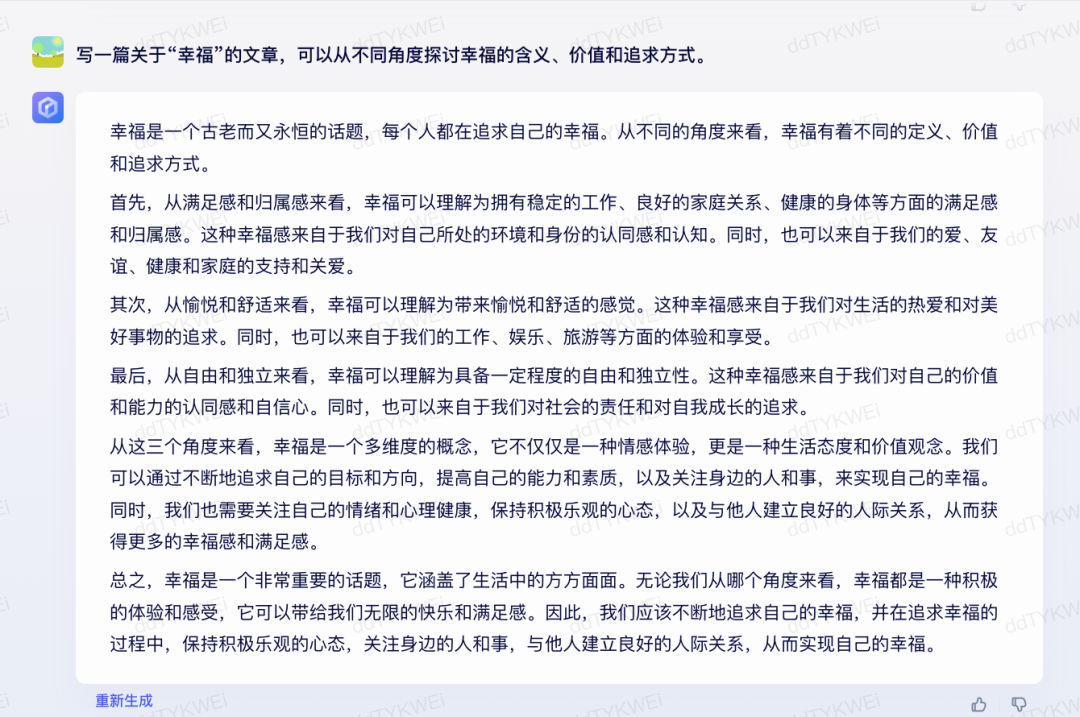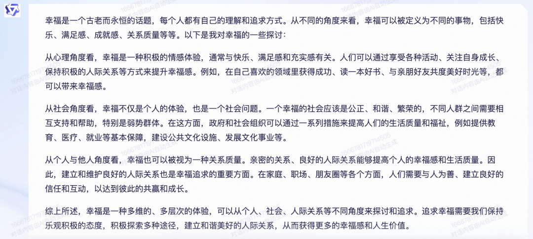 再看两者的小作文,第一句话居然神同步了。从内容来看,二者结构也基本相同,均是从各个角度阐述“幸福”,不过,文心一言更偏重个人层面的感受,而通义千问涉及到社会层面以及与他人的关系。整体来看,不分伯仲。大家觉得呢?