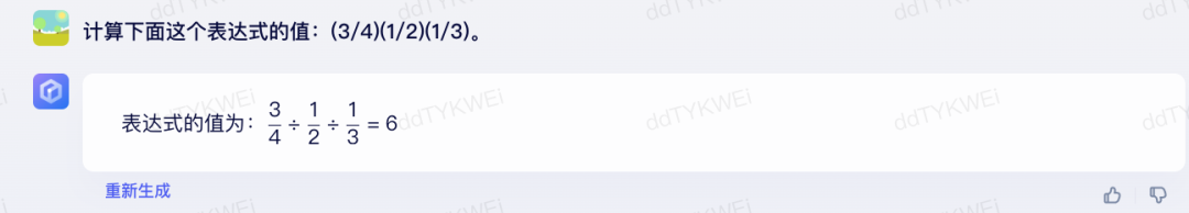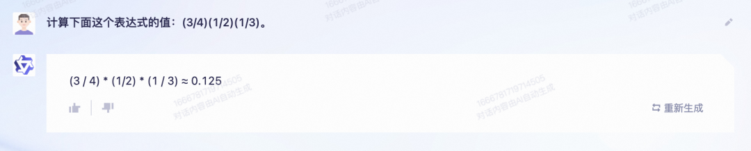 点评:又一次匪夷所思,这次轮到文心一言出的题目自己也做错了。这道题目是分数相乘的结果,文心一言理解成了除法。即便理解成除法,最后也不应该等于6。不知道这个结果怎么来的,迷之尴尬。通义千问理解对了,最后是1/8,即0.125,这是一个确定的值,不明白为什么最后它写的是“约等于”号,不知道是因为不自信,还是因为马虎写错了?