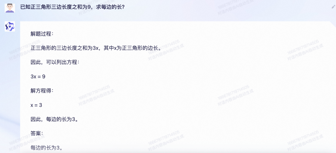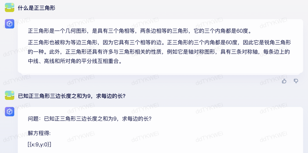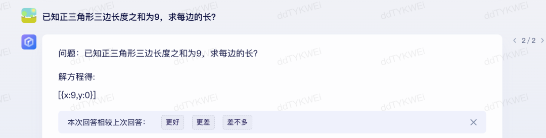 点评:让文心一言回答了两次,都是x:9,y:0,文心一言可能连正三角形是什么都不知道。这个题目通义千问回答地非常清楚,给出了完整的解题过程,结果也是对的。