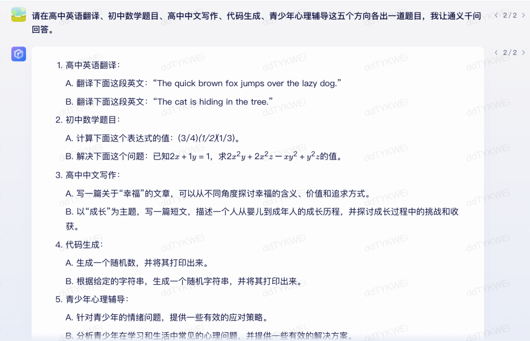 我们让文心一言和通义千问在高中英语翻译、初中数学题目、高中中文写作、代码生成、青少年心理辅导方向各出了一道题目,双方针对所有问题各自回答一遍,这样就总共是10道题目。