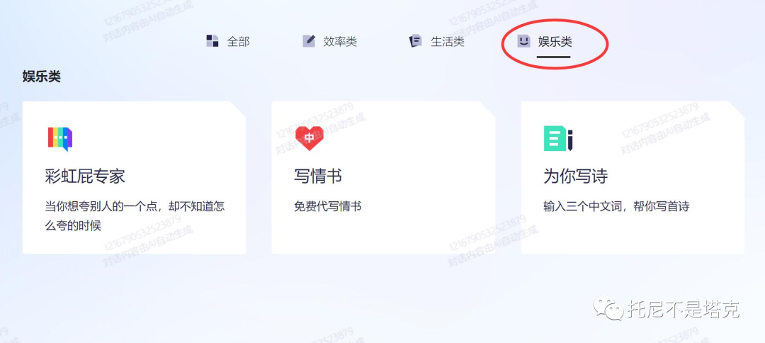 娱乐类,包括彩虹屁专家(哈哈哈哈),写情书,为你写诗。