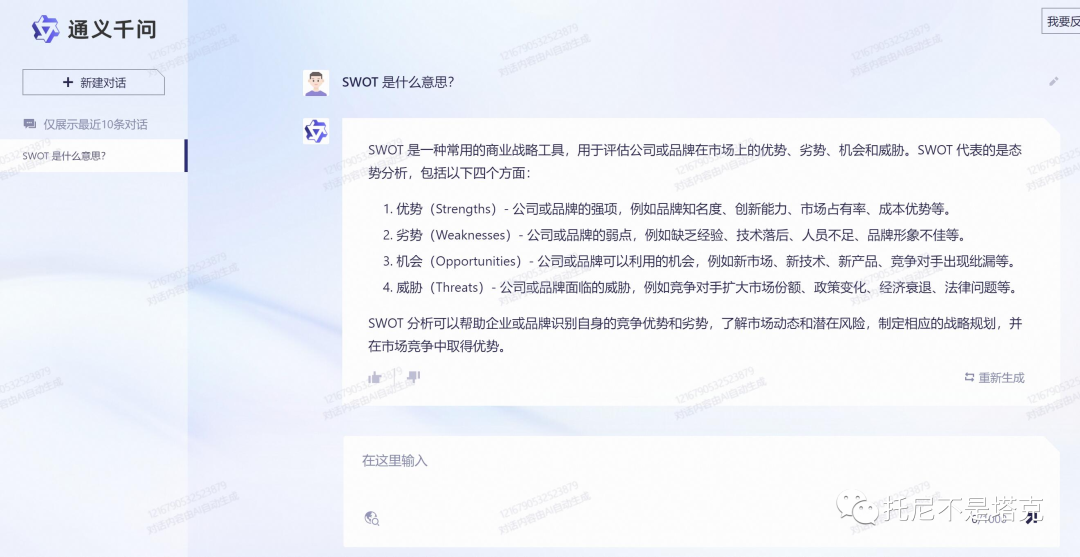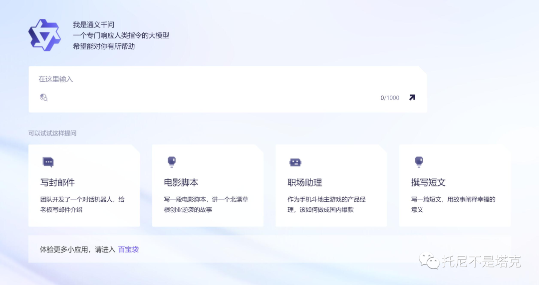 在观察通义千问的界面时,我们会发现其设计与众多GPT类应用相似。在该界面中,左侧部分呈现的是对话记录,而右侧则是聊天区域。位于右侧下方的位置则允许用户输入问题。值得注意的是,当前输入限制 set 为1000 字。