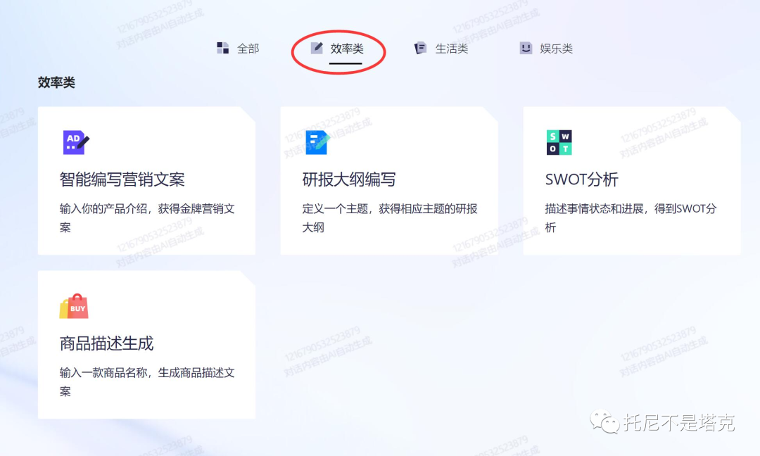 效率类,包含智能编写营销文案,研报大纲编写,SWOT分析,商品描述生成(很淘宝)。