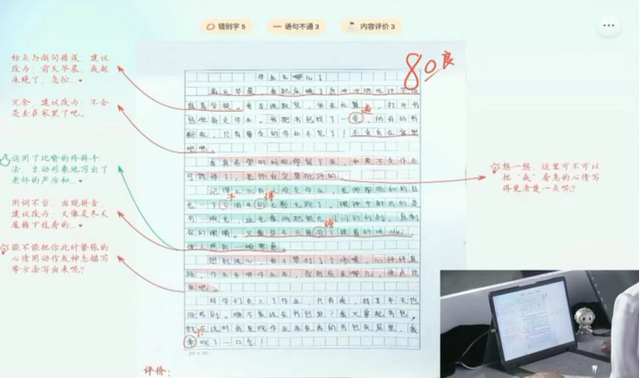 比如,在内置了星火的科大讯飞学习机T20系列上,可以实现中英文作文的精细批改,根据批改字词、批改语句、批改内容等几轮标准,可以综合多维度给出作文的卷面分,同时也给出了详细的修改优化建议。据测算,学校老师精批一篇作文大概需要30分钟,而讯飞只需要不到1分钟。 一个40人班制的老师批改作文就节约1200分钟,20个小时。 这个生产力的解放是真的很可。