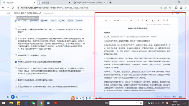 而听见会写更是让我们这样的文字工作者开心不已。在外采访、参会时,要实时背着电脑记录写稿是件把人逼疯的事,而“大模型+讯飞听见”,可以实现会议或者采访录音30秒就生成文字稿件,而这并非简单的语音转文字,而是带着“脑子”在分析完文字内容后,一键可以生成全文摘要、工作待办、工作计划、新闻稿件、宣传文案等多种文本。在5月6日发布会上,刘庆峰发介绍大模型后,讯飞听见会写立刻写出了一篇新闻稿件。即便是再熟练的记者也没有它快,用讯飞听见抢头条没得说。